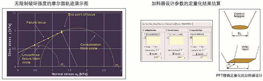 PFT軟件提供的自動分析可計算各種不同的粉體屬性,包括在料斗、加料器、大儲藏箱和筒倉中粉體能夠可靠流動的臨界尺寸。