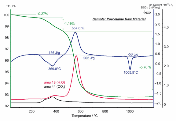 對陶瓷原材料的 STA 測試顯示了三個失重臺階。在約 250°C 以下,為吸附水的揮發。在 250°C 至 450°C 之間,觀察到了有機組分的燒失,釋放了 156 J/g 的能量。高嶺土的脫水發生在 450°C 以上,吸熱熱焓為 262 J/g。質譜曲線上的 18 與 44 質量數對應于 H2O 與 CO2 的逸出。1006°C 的 DSC 放熱峰(熱焓 -56 J/g)是由于固相轉變所致。