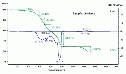 油氈作為一種建筑材料發明于1863年,常用于樓面覆蓋,具有堅固、絕緣等特點。通過STA在空氣氣氛下的測試,可揭示油氈的自然組成。150°C之前是水分的揮發,隨后的 200°C 至500°C 之間多步的失重主要是亞麻子油、天然樹脂、軟木屑、木屑和黃麻襯底等的燒失,伴隨著較大的放熱效應,在該氧化過程中釋放的熱量達 14.5KJ/g。在 600°C…750°C 之間,主要是填充物 CaCO3 的熱分解。