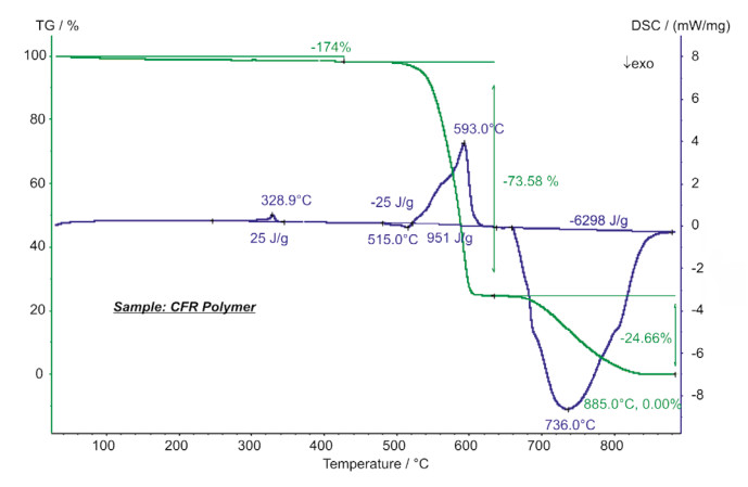 碳纖維增強高聚物(CFRP)是常用的復合材料。主要由聚合物和嵌入的碳纖維組成,具有質量輕、硬度大、穩定性強等特點,適合汽車、航空航天領域的應用。STA 的測試結果顯示,在 329°C 有一吸熱峰,其熱焓值為 25J/g,主要是聚合物的熔融過程。在大約 480°C…620°C之間主要是聚合物的分解。在 650°C,將氣氛由 N2 切換成 O2,碳纖維組分發生放熱分解(失重:24.7%)。實驗結束時的殘余質量 0.0% 表明樣品中無其他無機填充物或者玻璃纖維。