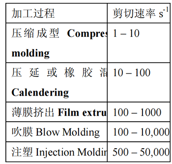 流動和粘度曲線反映了熱塑性材料在不同剪切和加工條件下的流動性能。大多數聚合物的加工采用塑化成型, 其過程覆蓋很寬的剪切速率范圍(如表1 所示)。為模擬不同的加工過程的流動性,我們需要在測量該加工過程的剪切速率下的粘度。