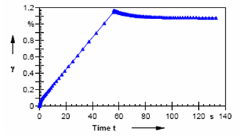 應力階梯變化(蠕變及回復)、應變階梯變化(應力松弛)、速率階梯變化(應力增加/開始流動)可以測量材料對于給定剪切應力、剪切應變或剪切速率的時間(瞬時)響應。分析方法包括計算一些重要的材料參數,如零剪切粘度、平臺模量、蠕變柔量和將瞬態材料函數轉換為動態材料函數- G’(ω)G”(ω)。圖六中,提供了應力增加測試實例。